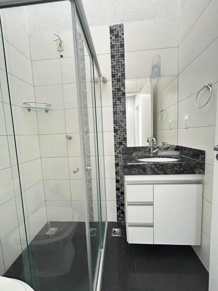 Um banho social com box e armário;